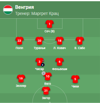 Венгрия:Сеч - Папп, Тураньи, Л. Ковач (Шаванья, 46), В. Сабо - Чисар, Феньвеши (Кочан, 79) - Зеллер, Ваго (Саконьи, 90+4), Чики (Папой, 46)- Загор (Немет, 62).