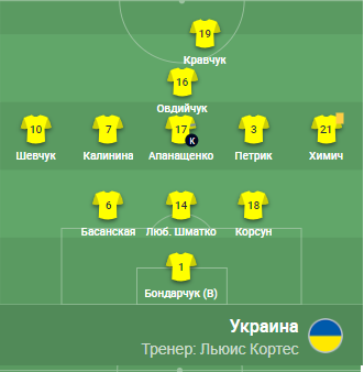 Украина:Бондарчук - Корсун, Люб. Шматко, Басанская (Малахова, 79) - Химич, Петрик (Кунина, 60), Апанащенко, Калинина (Кравец, 46), Шевчук - Овдийчук, Кравчук (Андрухив, 70).